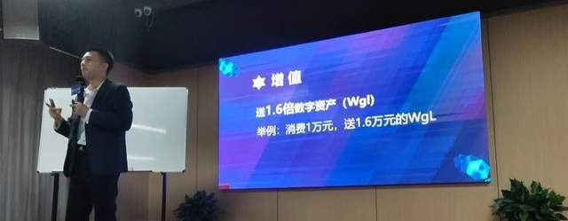 会上,为了吸引大家投资,特赠送增值产品,送1.6倍数字资产(Wgl),举例:消费1万元,送1.6万元的Wgl。投资人现场刷卡,POS机小票显示商户名称为展麟科技2023。
