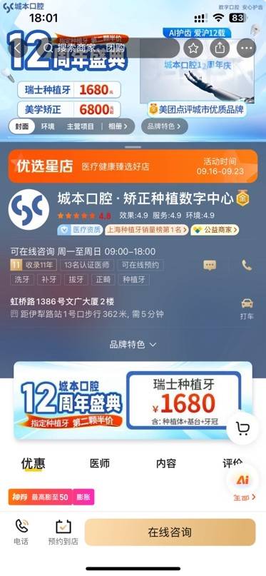 公开信息显示,上海城本口腔成立于2013年,前身为上海圣贝口腔,位于上海长宁区黄金地段,拥有3000平米巨量空间,25把高端进口牙椅,设有种植牙、美学正畸、早矫、美学修复、儿童口腔、综合特色齿科六大诊疗中心。城本口腔拥有口碑、技术俱佳的硕博专家团,汇聚了来自上海九院、华西口腔医院、上海中山医院等三甲医院知名专家,以及韩国、台湾的硕博专家,全面涵盖六大诊疗中心各细分领域。在美团平台,上海城本口腔目前还坐拥“上海种植牙销量榜第一名”的宝座。