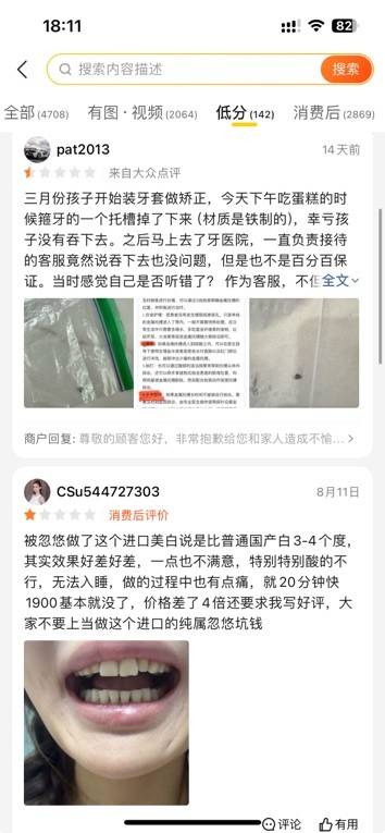 “三月份孩子开始装牙套做矫正,今天下午吃蛋糕的时候箍牙的一个托槽掉了下来(材质是铁制的),幸亏孩子没有吞下去。之后马上去了牙医院,一直负责接待的客服竟然说吞下去也没问题,但是也不是百分百保证。当时感觉自己是否听错了?作为客服,不但没有安抚我们的情绪,反倒觉得孩子如果吞了铁制的托槽是天经地义的事情。如果看到这个评论,希望还没有光顾的你三思而后行吧!顺便科普一下城本的客服,好好学习看看,不要再误导传递不负责的信息”。