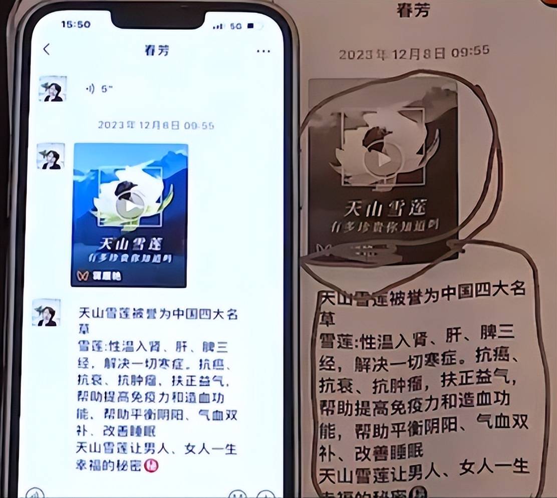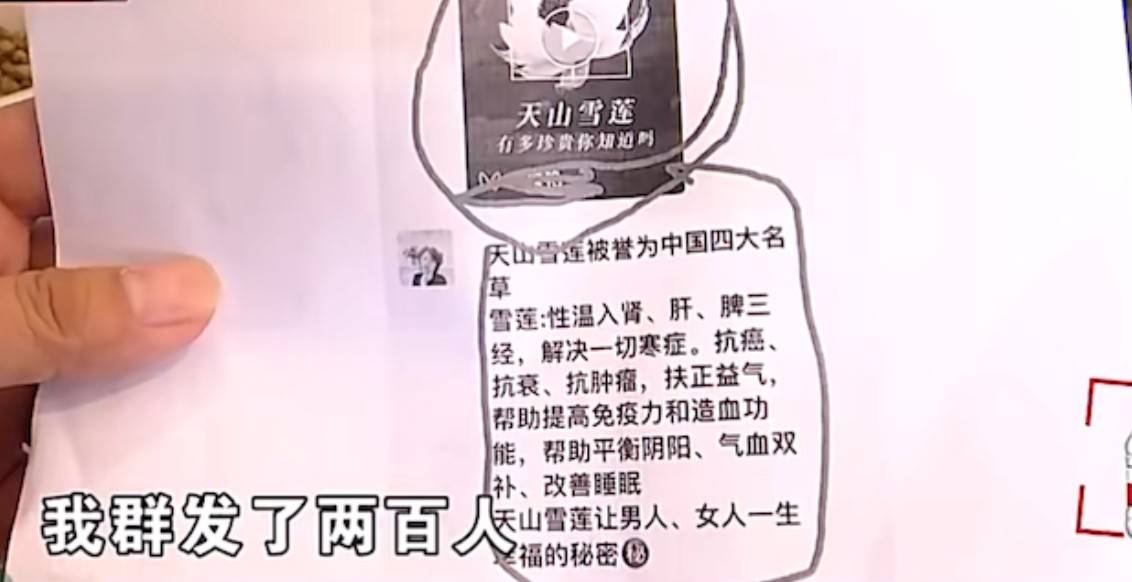 金女士还提到,生活馆曾向她推销天山雪莲保健品,声称具有抗癌功效。她提供的微信聊天记录显示,2023年12月8日,老板娘徐女士向她发送了天山雪莲的图片和介绍,称其具有抗癌、抗衰、抗肿瘤等功效。