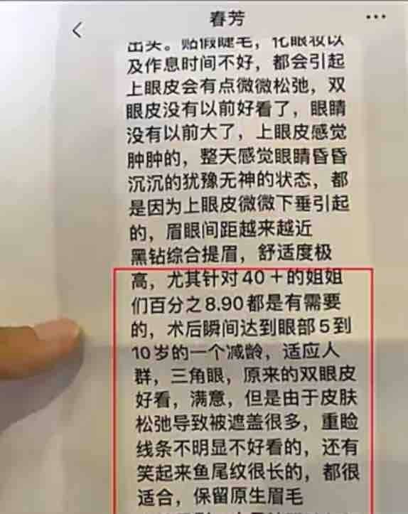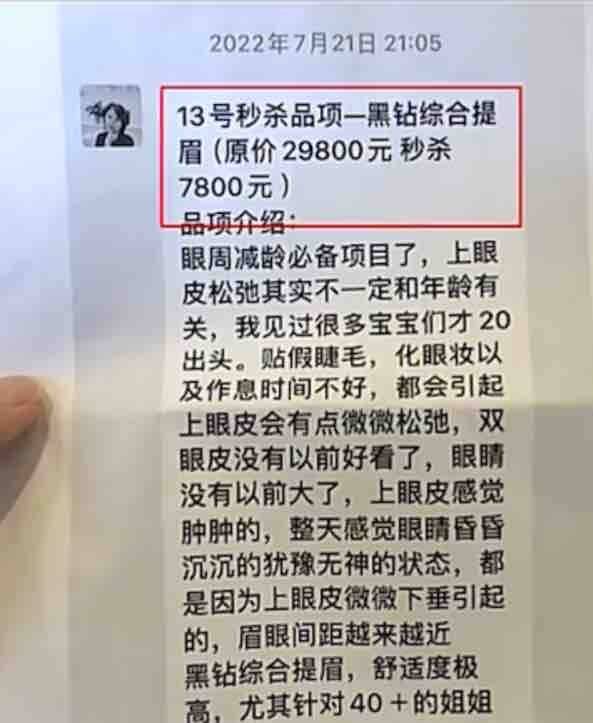 金女士展示了她与徐女士的微信聊天记录,记录显示徐女士曾在2022年7月21日向她推荐了一个名为“秒杀黑钻综合提眉”的项目,声称特别适合40岁以上的女性,能让眼部看起来年轻5到10岁。