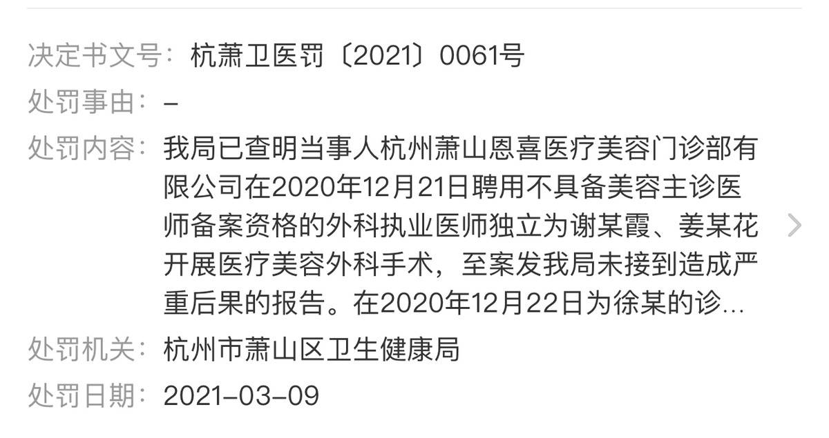 更值得关注的是,2021年3月,杭州市萧山区卫生健康局已查明当事人杭州萧山恩喜医疗美容门诊部有限公司在2020年12月21日聘用不具备美容主诊医师备案资格的外科执业医师独立为谢某霞、姜某花开展医疗美容外科手术。