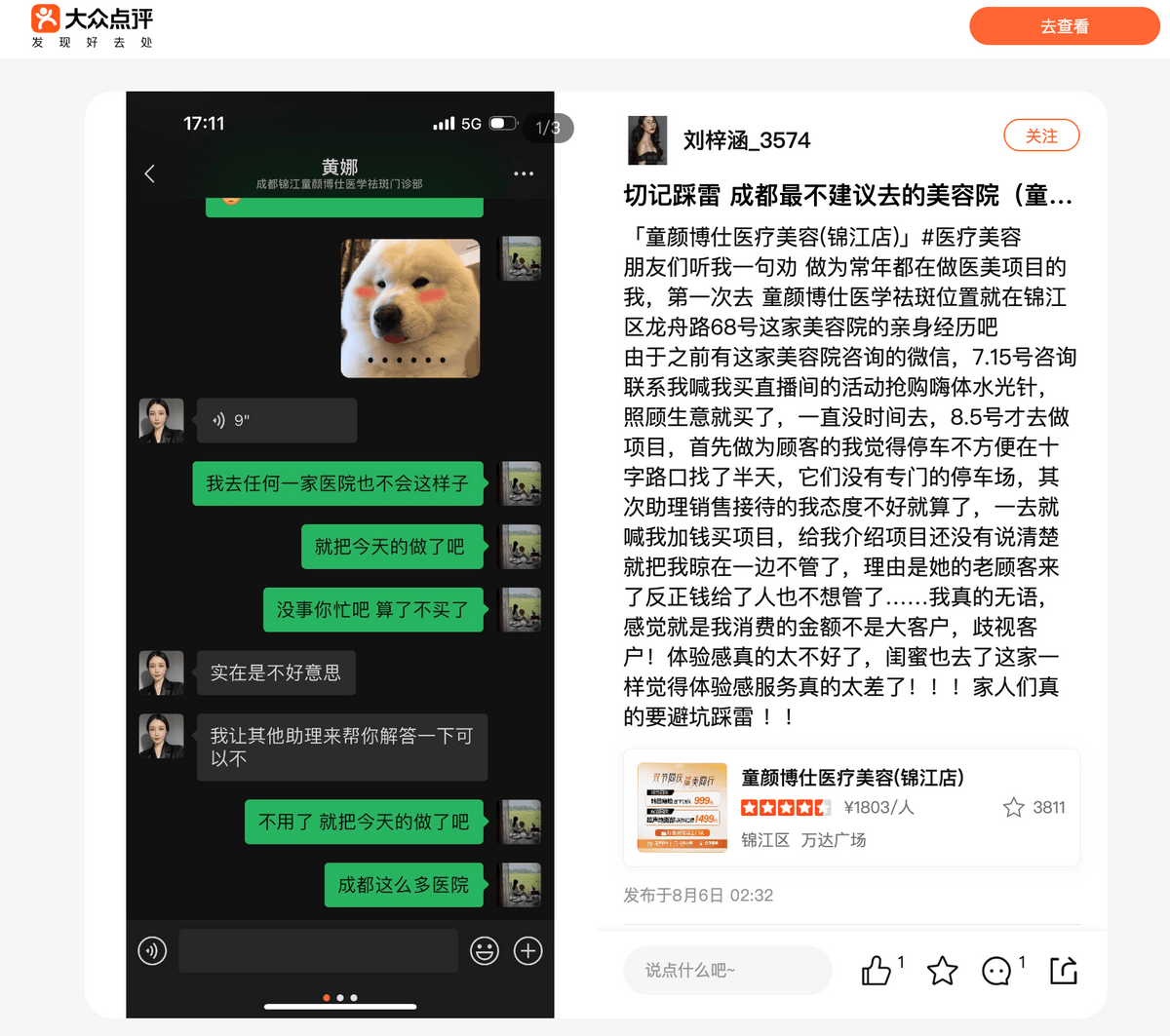 去年9月,成都锦江童颜博仕医学祛斑门诊部有限公司被诉“虚假宣传,服务态度极差”,“本人是从抖音了解到童颜祛斑的,当时有体验价格198元三次祛斑,到店后有专人接待,经过她的讲解和宣传,建议我不购买198元的体验,给我定制了12800元的祛斑套餐,我当时也很相信和期待祛斑后变美,但是做了几次感觉效果不是我预期的效果,而且接待我的医生服务态度极差,不消费就转变态度的”。