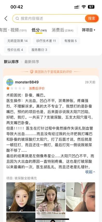 在美团点评平台上,我们也能够看到关于成都童颜博仕医美众多的负面评价信息。其中,关于机构效果差、有推销的投诉最引人关注,品牌旗下两家机构都在此类问题上饱受诟病。