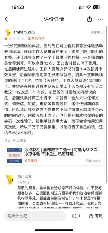“一次特别糟糕的体验,当时先在网上看到有首次体验活动去到现场,现场工作人员推荐在美团上购买了腋下脱毛的套餐,还让现金支付了一个手臂脱毛的套餐,一直强调的是套餐划算,可以享受12次,因此当时就支付了费用。在后期使用过程中,工作人员每次都说前面3-4次按月来效果好,后面的就看毛发生长来做就行。因此一直断断续续的使用了7次,结果今天预约,工作人员就说1年到期了”。