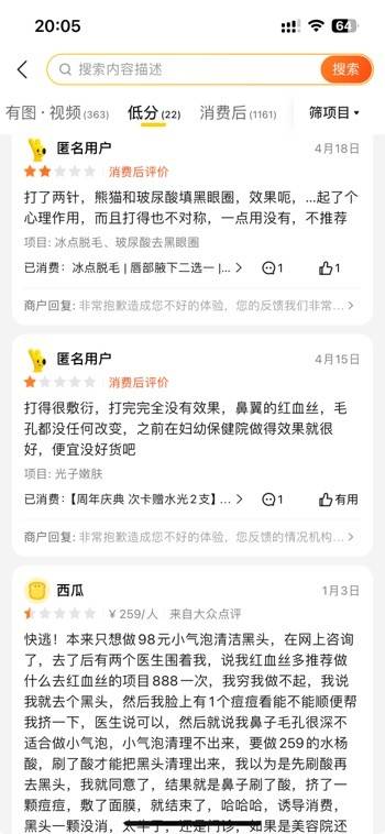 “快逃!本来只想做98元小气泡清洁黑头,在网上咨询了,去了后有两个医生围着我,说我红血丝多推荐做什么去红血丝的项目888一次,我穷我做不起,我说我就去个黑头,然后我脸上有1个痘痘看能不能顺便帮我挤一下,医生说可以,然后就说我鼻子毛孔很深不适合做小气泡,小气泡清理不出来,要做259的水杨酸,刷了酸才能把黑头清理出来,我以为是先刷酸再去黑头,我就同意了,结果就是鼻子刷了酸,挤了一颗痘痘,敷了面膜,就结束了,哈哈哈,诱导消费,黑头一颗没消,太牛了,还是门诊,如果是美容院还不得天价,真的是诱导消费,98的不推荐你做效果不好,推荐你做259的,效果也不好,真是搞笑,准备去12315投诉了,太无耻了”。