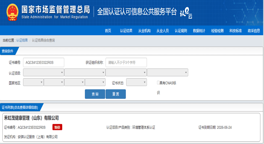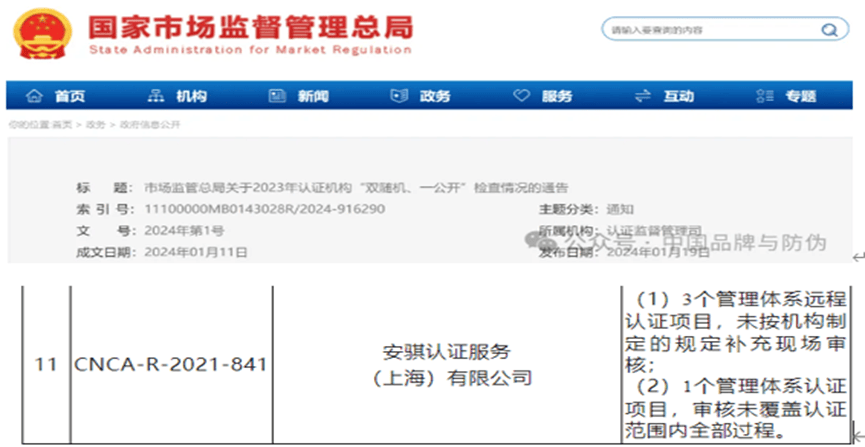 记者通过“国家认证认可监督管理委员会”官方网站查询发现上述三个“管理体系认证”证书均已暂停。不仅如此,上述证书的颁发单位安骐认证服务(上海)有限公司在国家市场监管总局关于2023年认证机构“双随机、一公开”检查情况的通告中,因“3个管理体系远程认证项目,未按机构制定的规定补充现场审核以及1个管理体系认证项目,审核未覆盖认证范围内全部过程”被要求限期整改。