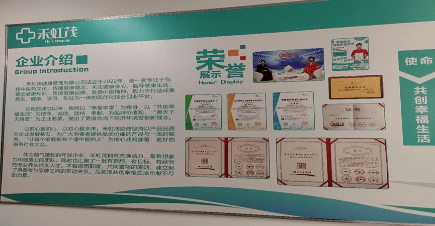 记者在禾虹茂公司荣誉墙上发现数张资质证书,其中包括“环境管理体系认证证书”、“职业健康安全管理体系认证证书”、“质量管理体系认证证书”以及“诚信企业大健康行业倡导典型案例”、“诚信建设优秀企业家”等荣誉资质。
