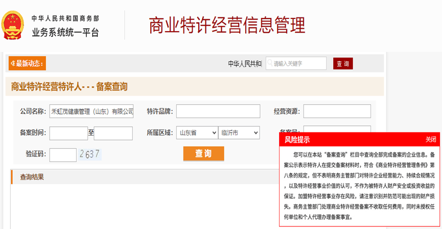 记者了解到,禾虹茂公司从开始收取的加盟费15.8万到如今的19.8万,仅仅是个代理资格,不含一分钱产品。即便在这种情况下,该公司两年多时间里,全国已发展400多家区县代理,加盟费高达数千万。然而在商务部官网“商业特许经营信息管理系统”中记者并未查询到该公司的备案登记信息。