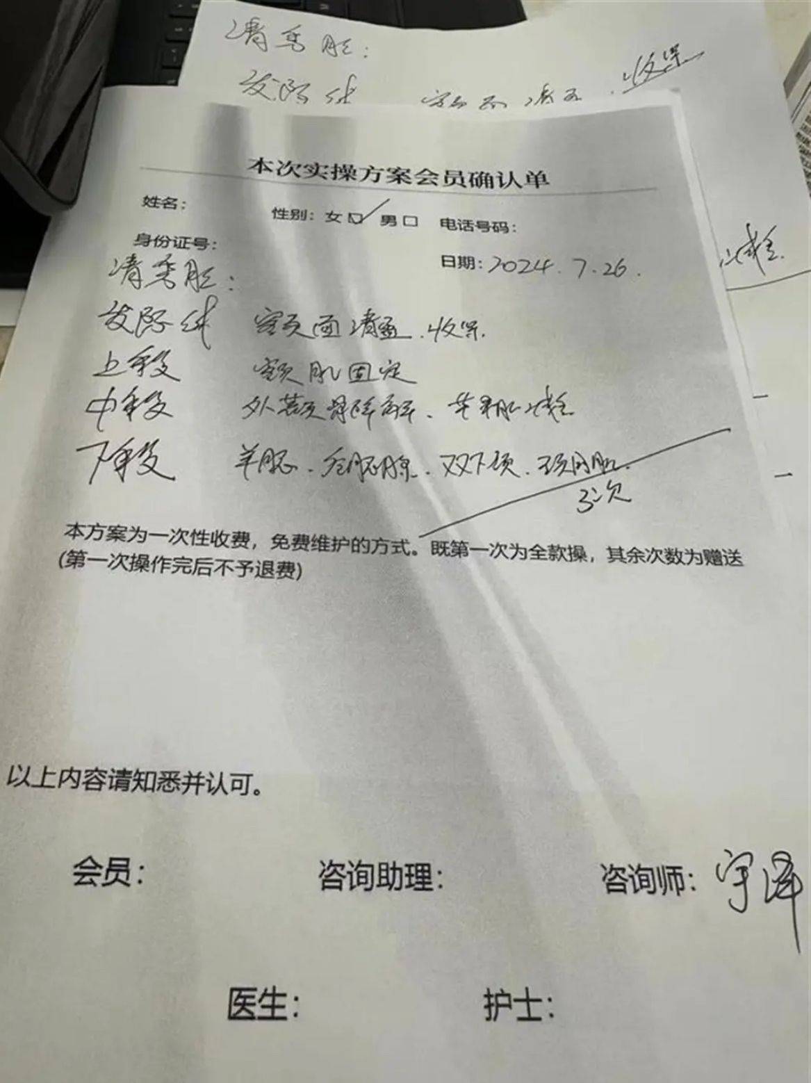 在“咏泰医美”等待了一段时间后,杨女士被带去见了该机构的咨询师。这位咨询师在没有出示任何相关证件的情况下,为杨女士制定了一套名为“清秀脸”的医疗方案。