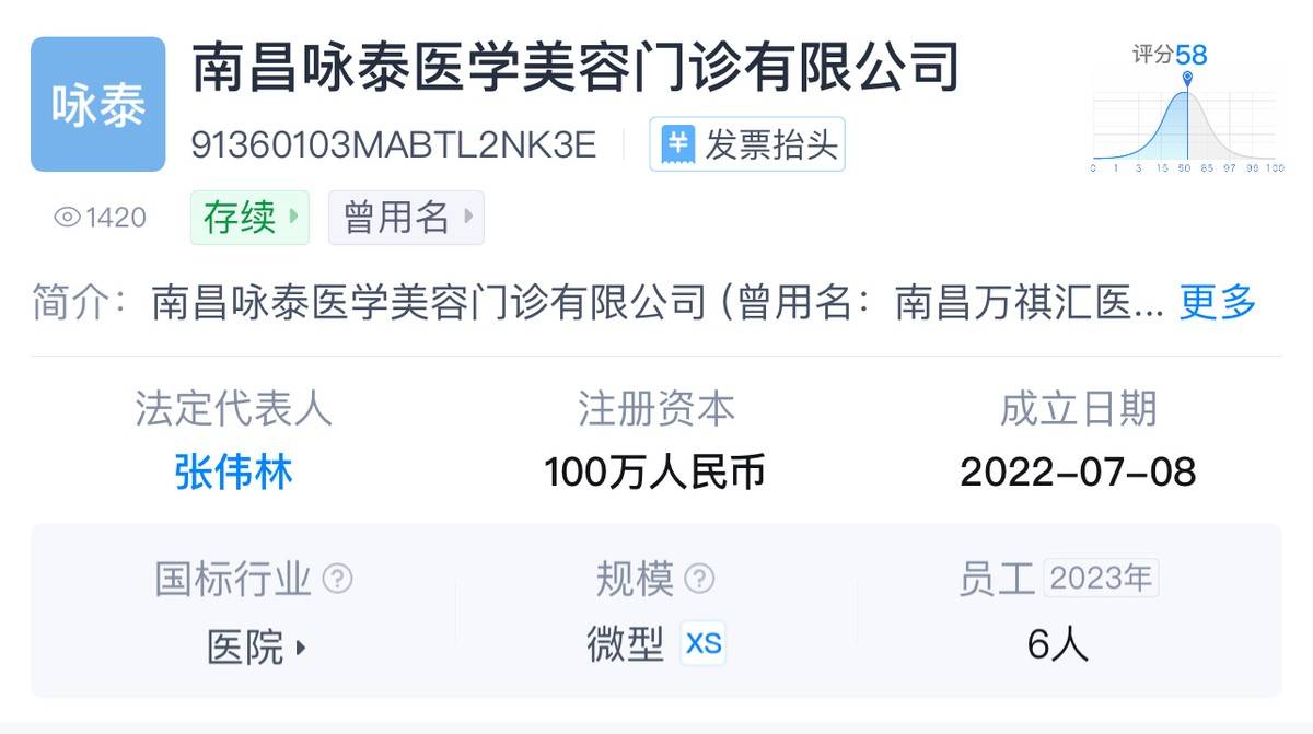 深度美业调查发现,“南昌咏泰医学美容门诊有限公司 (曾用名:南昌万祺汇医学美容门诊有限公司) ,成立于2022年,位于江西省南昌市,是一家以从事卫生为主的企业。企业注册资本100万人民币,实缴资本100万人民币。法定代表人为张伟林,经营范围包含医疗美容服务、生活美容服务及第三类医疗器械经营等,企业自身风险1条。成立仅仅两年的医美机构,又有多少案例可供消费者判断其服务质量呢?