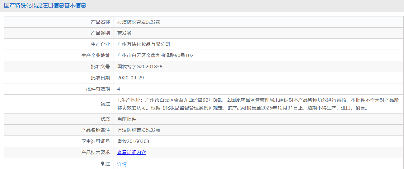 药监局官网信息显示,批准文号国妆特字G20201838的产品名称为万洁防脱育发洗发露,而非希草集。很显然,希草集是贴牌套证万洁防脱育发洗发露。