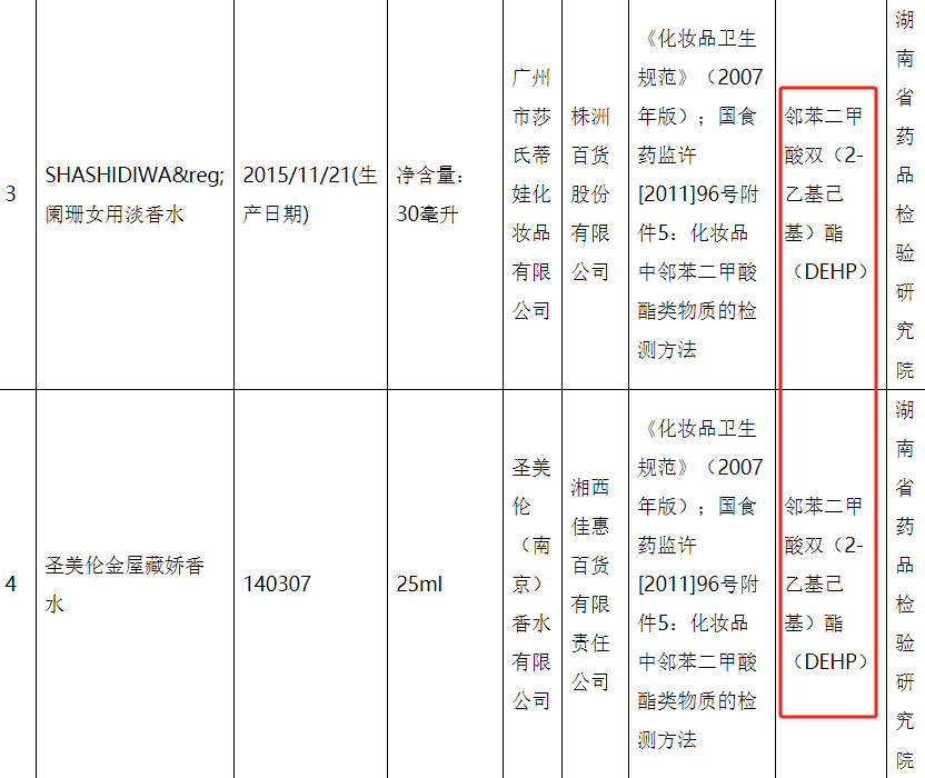 2016年12月14日,湖南省食品药品监督管理局发布的《2016年湖南省化妆品监督抽验质量公告》显示,SHASHIDIWA®;阑珊女用淡香水和圣美伦金屋藏娇香水,因被检出邻苯二甲酸双(2-乙基己基)酯(DEHP),被认定不合格。