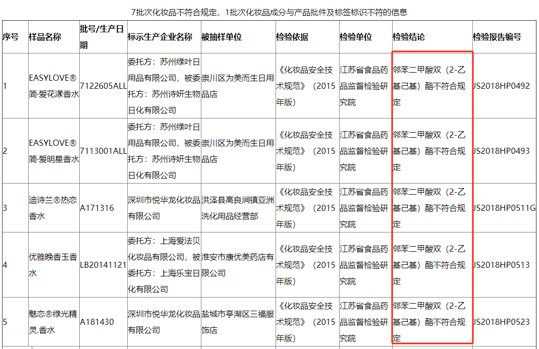 2019年7月4日,江苏省药品监督管理局发布的《7批次化妆品不符合规定、1批次化妆品成分与产品批件及标签标识不符的信息》显示,EASYLOVE®简·爱花漾香水、EASYLOVE®简·爱明星香水、迪诗兰®热恋香水、优雅晚香玉香水和魅恋®绿光精灵.香水5批次样品,因检出邻苯二甲酸双(2-乙基己基)酯,违反了《化妆品安全技术规范》(2015年版)规定。