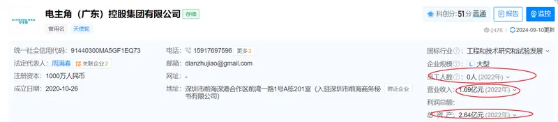 值得注意的是,天眼查信息显示,2022年电主角总资产2.64亿元,营收1.69亿元。那么如此经营状况,为何公司连实际经营地址都没有?注册地址也是一直挂靠?