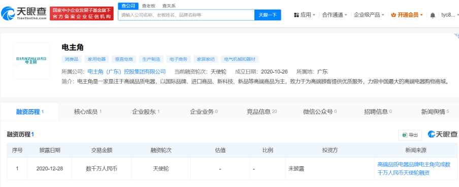 同时,天眼查信息显示,在电主角融资历程栏中,也仅有天使轮的融资动态,并未显示有pre-A轮融资。