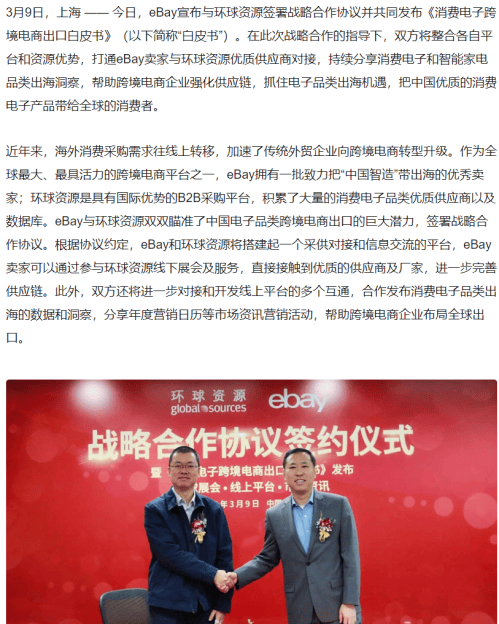 经记者查询,《消费电子跨境电商出口白皮书》是eBay与环球资源签署战略合作协议并共同发布,该白皮书发布时间为2022年3月9日。上述媒体消息内容与eBay与环球资源签署战略合作的新闻内容极为相似。
