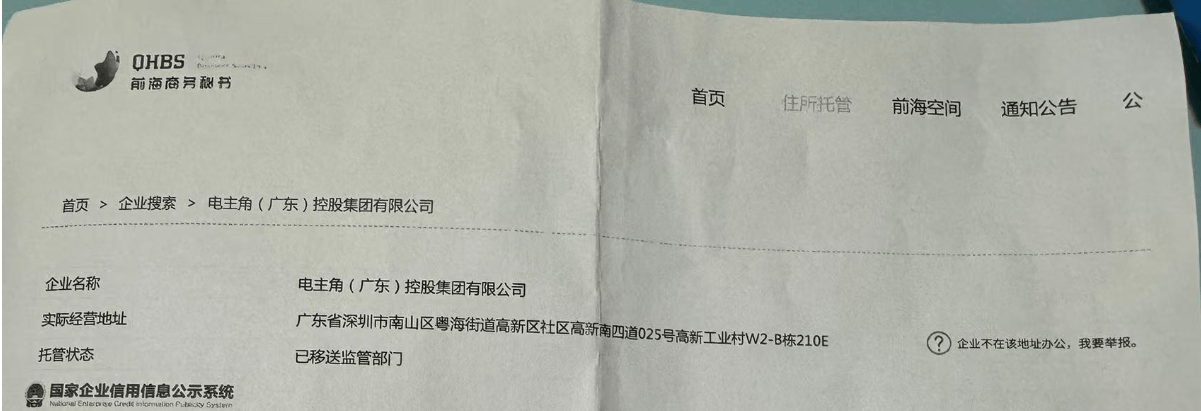 然后,记者以与电主角存在业务往来为由,询问办事处关于该公司实际经营场所。对此,工作人员表示,“电主角已经两年没提交实际经营地址了,目前仍旧用我们的地址作为注册地址,我们已经将其移送监管部门。”