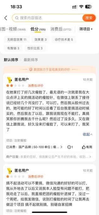 “搞不起活动可以不要搞,微信沟通的好好的可以打,我从外地去了以后又说我本人脸型有问题不能打,把我劝走了以后,我直接把团的瘦脸针退掉了,没过一个周吧,给我发微信,说到打瘦脸的时间了让我再去做这个项目,搞不起就别搞,别砸自家招牌”。