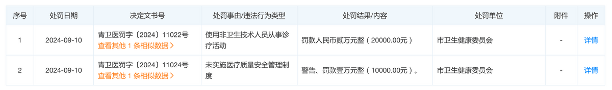 据悉,2024年9月,青岛博士医疗美容医院有限公司分别因使用非卫生技术人员从事诊疗活动、未实施医疗质量安全管理制度的违法行为连续收到青岛市卫生健康委员会的两张罚单, 并分别被处以罚款人民币贰万元整和警告、罚款壹万元整。