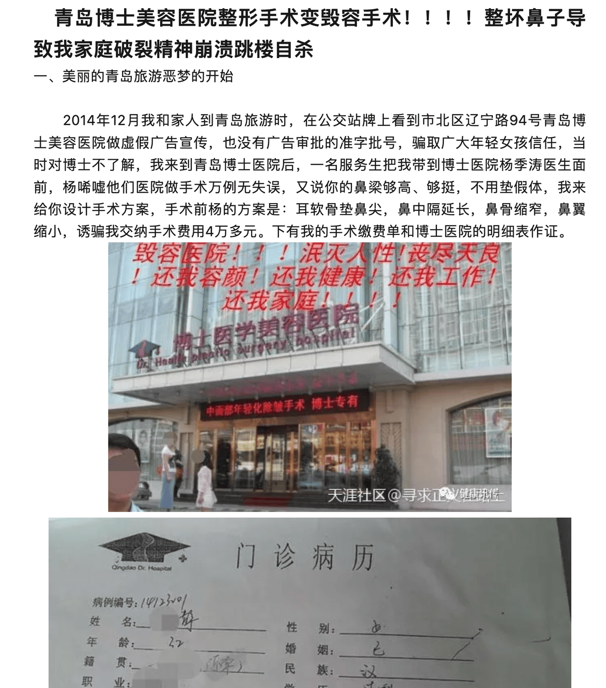 网络上一篇题为“青岛博士医学美容院整形失败变毁容 导致家庭破裂精神崩溃”的报道显示,2014年12月,一名消费者到青岛旅游时,在公交站牌上看到市北区辽宁路94号青岛博士美容医院做虚假广告宣传,“也没有广告审批的准字批号,骗取广大年轻女孩信任,当时对博士不了解,我来到青岛博士医院后,一名服务生把我带到博士医院杨季涛医生面前,杨吹嘘他们医院做手术万例无失误,又说你的鼻梁够高、够挺,不用垫假体,我来给你设计手术方案,手术前杨的方案是:耳软骨垫鼻尖,鼻中隔延长,鼻骨缩窄,鼻翼缩小,诱骗我交纳手术费用4万多元”。