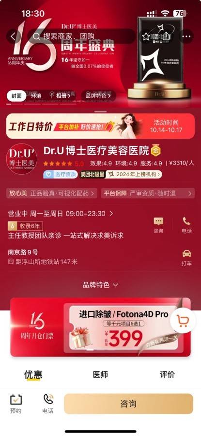此外,青岛博士医疗美容医院位于山东青岛市南区南京路9号,2019年品牌升级为“Dr.U博士医美”,营业面积2000多平方米,员工200余人,是一家国际化的医疗美容机构,专注于医学美容、皮肤科、美容外科科室,开展眼部整形、鼻部整形、注射美容等项目,力求把专业的医学美容技术带给爱美人士。