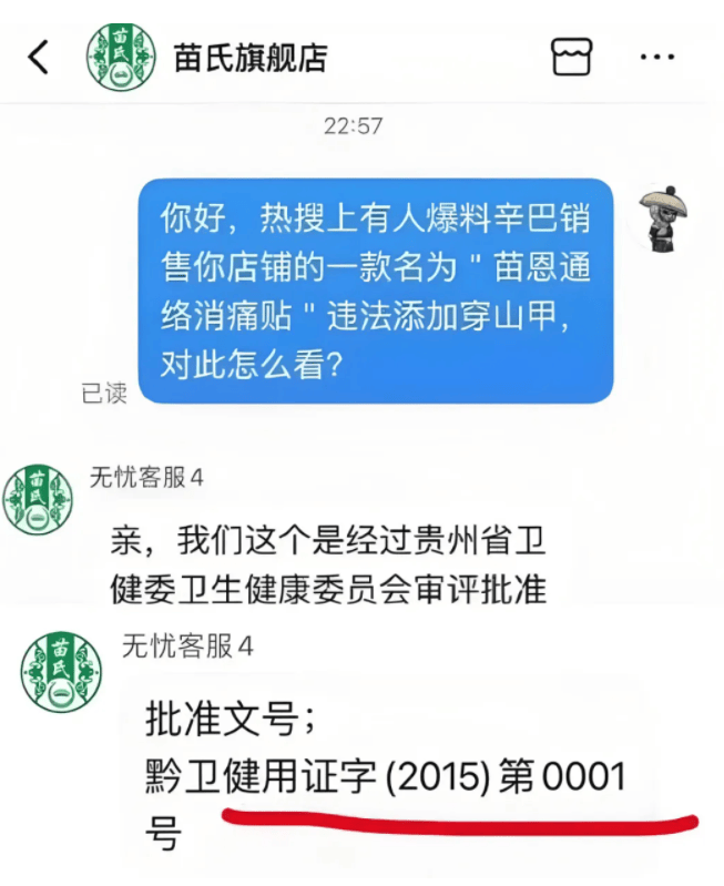 面对刘江的指控,“苗恩通络消痛贴”的厂家贵州苗恩堂医药有限公司和贵州苗氏大健康产业(集团)有限公司,以名誉权纠纷把刘江给起诉了。据“苗恩通络消痛贴”的苗氏旗舰店客服解释,该款产品是由贵州省卫健委审批批准的。