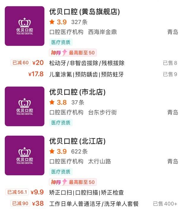 美团点评平台信息显示,优贝口腔在青岛地区的规模不小,仅在青岛就有三家门店。不过,各机构的整体评分表现非常一般。
