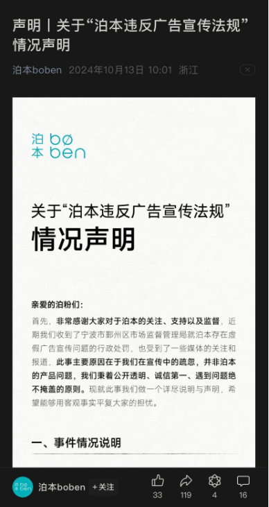 泊本在收到处罚后,通过其官方微信公众号发布了情况声明,表示此次事件的发生源于内部管理问题,电商团队没有充分学习抖音直播宣称规则、市场监督管理局法规,导致直播间主播话术未按照广告法规要求表达。