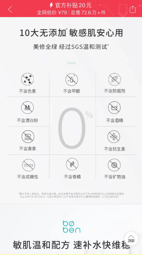 泊本在京东、拼多多和抖音等多个电商平台的旗舰店中,很多产品都宣传着“10大无添加,温和不刺激”以及“10大无添加,敏感肌安心使用”等类似文案,强调其产品“无色素、无甲醛、无防腐剂、无香精”等十大无添加的特点。