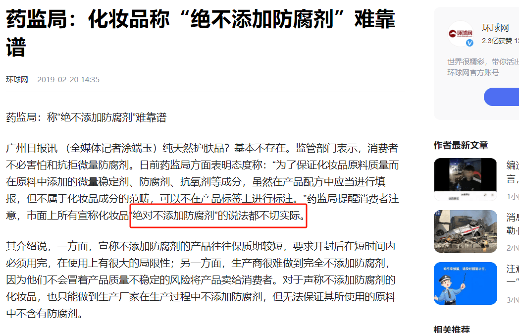 早在2019年,药监局就已公开指出,市场上所有宣称化妆品“绝对不添加防腐剂”的说法均不符合实际情况。一方面,那些声称不含防腐剂的产品通常保质期较短,要求消费者在开封后尽快使用完毕,这在实际应用中带来了很大的限制;另一方面,生产商很难完全避免防腐剂的添加,因为他们不愿承担产品质量不稳定的风险而将其产品推向市场。对于标榜不添加防腐剂的化妆品,其生产厂家或许能在生产过程中避免直接添加防腐剂,但却无法保证所使用的原料中完全不含有防腐剂成分。