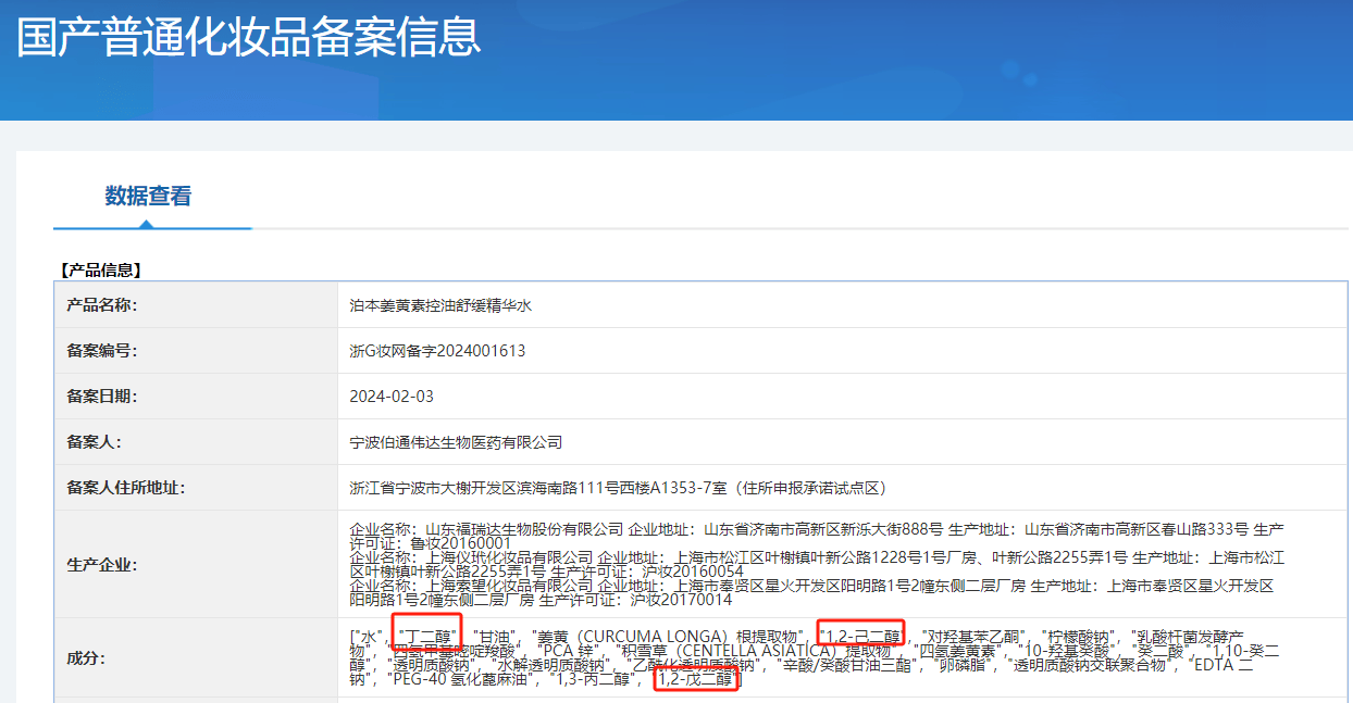 以“泊本姜黄素控油舒缓精华水”(备案号:浙G妆网备字2024001613)为例,经由国家药品监督管理局官方网站上的“国产普通化妆品备案信息查询”系统检索得知,该化妆品在其备案信息中明确列出了“丁二醇”、“1,2-己二醇”和“1,2-戊二醇”作为其成分。