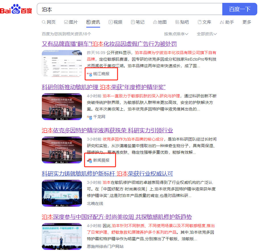 于是乎,在百度上搜索“泊本”时,映入眼帘的既有泊本品牌获奖的喜讯,也有其因违规被罚款的新闻,且这些报道均出自权威媒体之手。例如,钱江晚报发表了题为《品牌直播“翻车”!泊本化妆品因虚假广告行为遭处罚》的文章,而新闻晨报则发布了《泊本依克多因特护精华液荣耀加冕 科研实力领航业界》的报道。