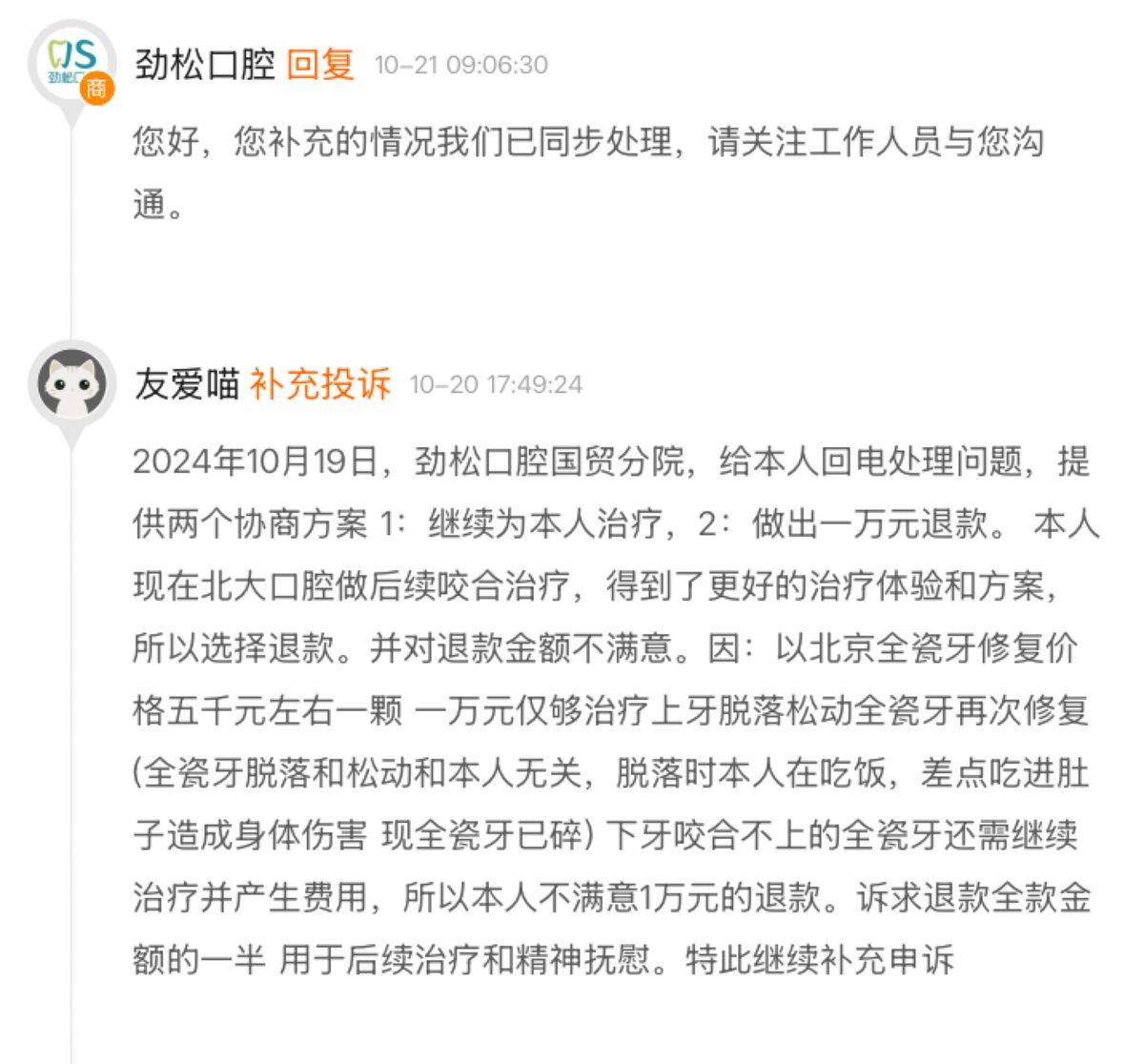 2024年10月19日,劲松口腔国贸分院联系消费者处理问题,并提供了两个协商方案:1. 继续为消费者治疗;2. 退还一万元。消费者目前正在北大口腔接受后续咬合治疗,获得了更好的治疗体验和方案,因此选择了退款。
