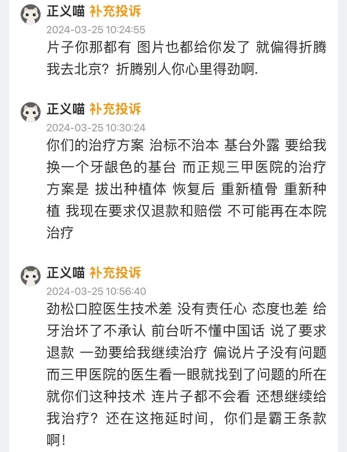 10月18日,有消费者在黑猫投诉平台投诉劲松口腔。据该消费者描述: