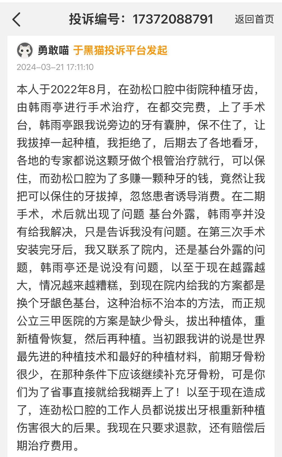 2劲松口腔最初承诺使用的是世界最先进的种植技术和最好的种植材料,但在牙骨粉不足的情况下,应继续补充牙骨粉,然而劲松口腔为了省事,未能妥善处理,导致现在的后果。甚至连劲松口腔的工作人员也承认,拔出牙根重新种植会造成很大的伤害。消费者仅要求退还已支付的费用,并赔偿后期治疗费用。该投诉发生后,劲松口腔于4月22日,由消费者确认达成和解。