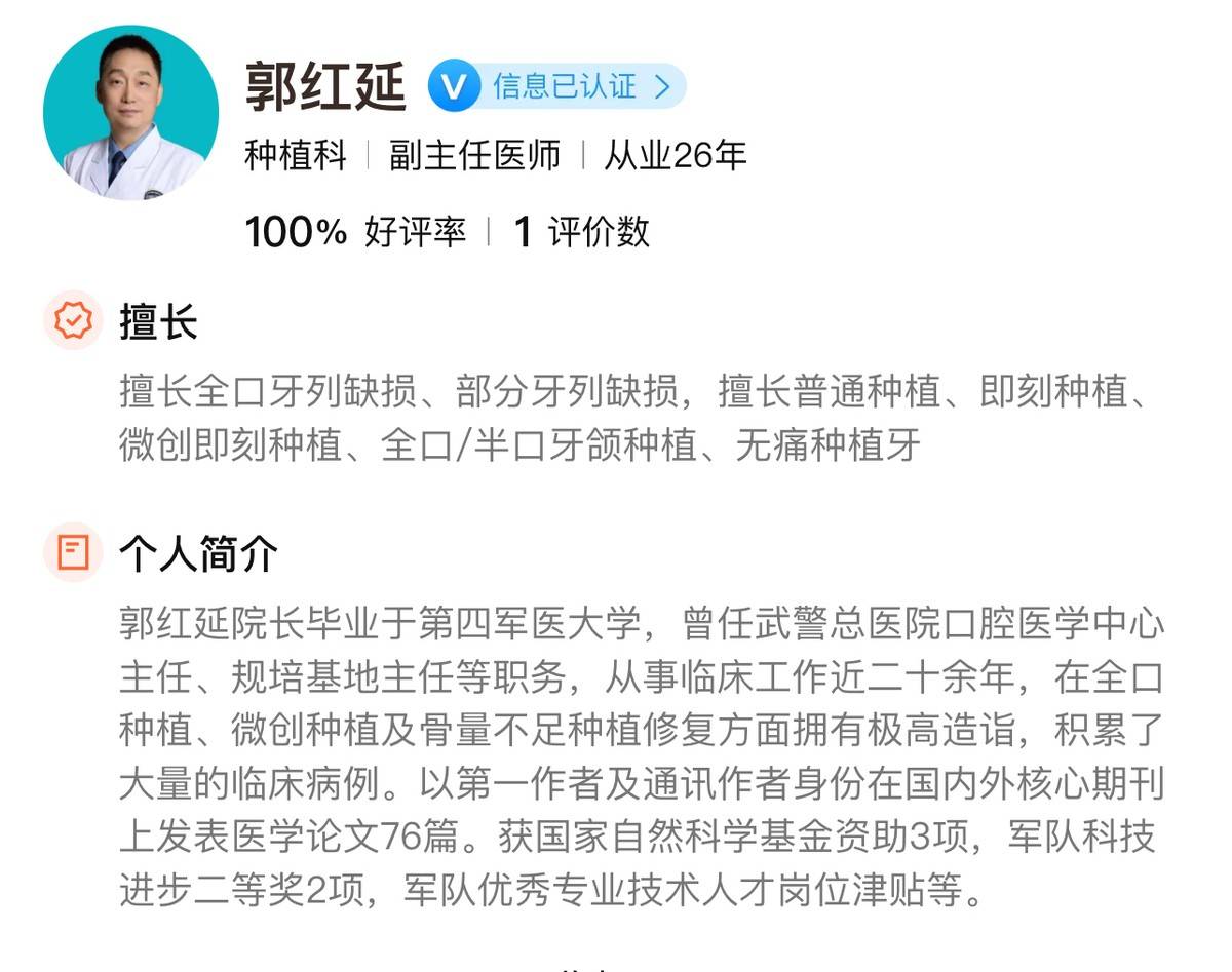 公开资料显示,郭红延为副主任医师、执业医师,毕业于第四军医大学,医学博士、硕导,现任北京劲松口腔医院五棵松口腔门诊部医疗院长兼种植院长。