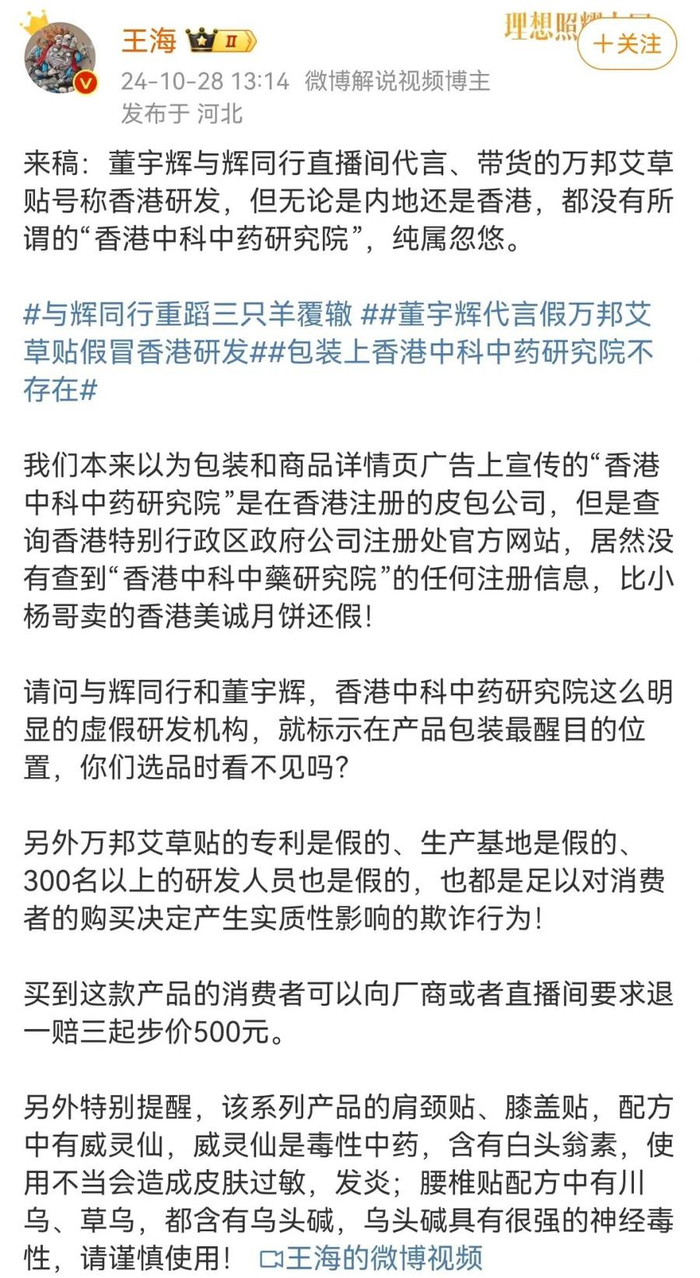 10月28日,知名打假人王海发文称,“来稿:董宇辉与辉同行直播间代言、带货的万邦艾草贴号称香港研发,但无论是内地还是香港,都没有所谓的‘香港中科中药研究院’,纯属忽悠。”