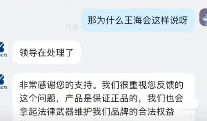 对方称该起事件“领导在处理了。产品是保证正品的,我们也会拿起法律武器维护我们品牌的合法权益。”