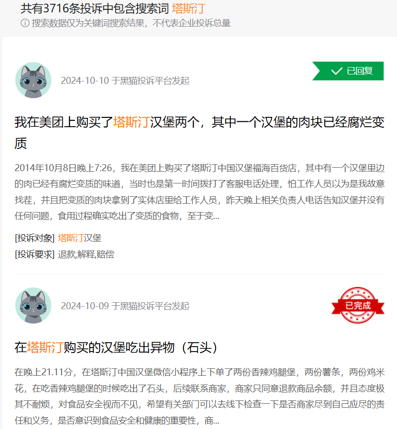 在黑猫投诉平台上,关于塔斯汀的投诉多达3700条,其中大部分投诉反映汉堡中的肉不熟,另外还有出餐速度慢以及服务员态度不佳等投诉。