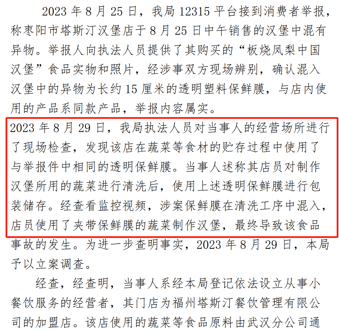 根据企查查App信息显示,在去年11月份,原枣阳市塔斯汀汉堡店曾因消费者投诉食品中含有异物(保鲜膜)而遭到处理。经枣阳市市场监督管理局调查发现,此情况系由于在清洗食材时不小心混入了保鲜膜,之后店员使用了带有保鲜膜的蔬菜制作汉堡所致。