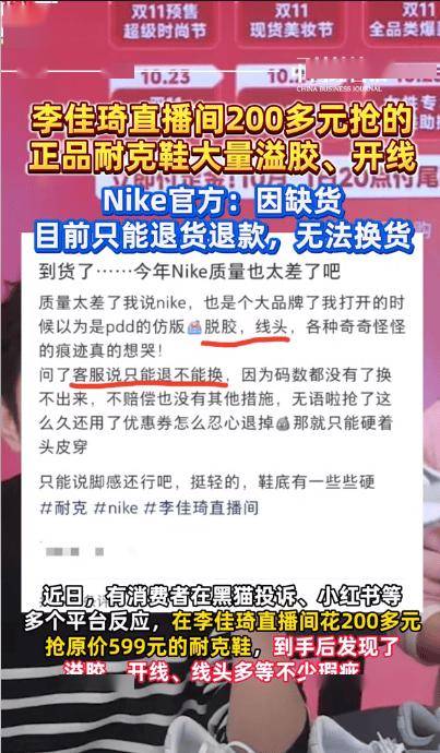 李佳琦带货耐克鞋品质差遭质疑:Nike官方仅提供退货退款