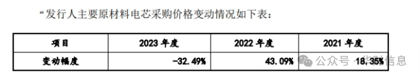 招股说明书显示,电芯作为公司成本占比最高的主要原材料,采购金额占总采购金额的70%-80%。由于电芯采购单价被交易所同意豁免披露,《华财》只能了解到电芯采购价格在报告期内的变动情况:2022年上升43.09%,2023年下降32.49%(下图)。