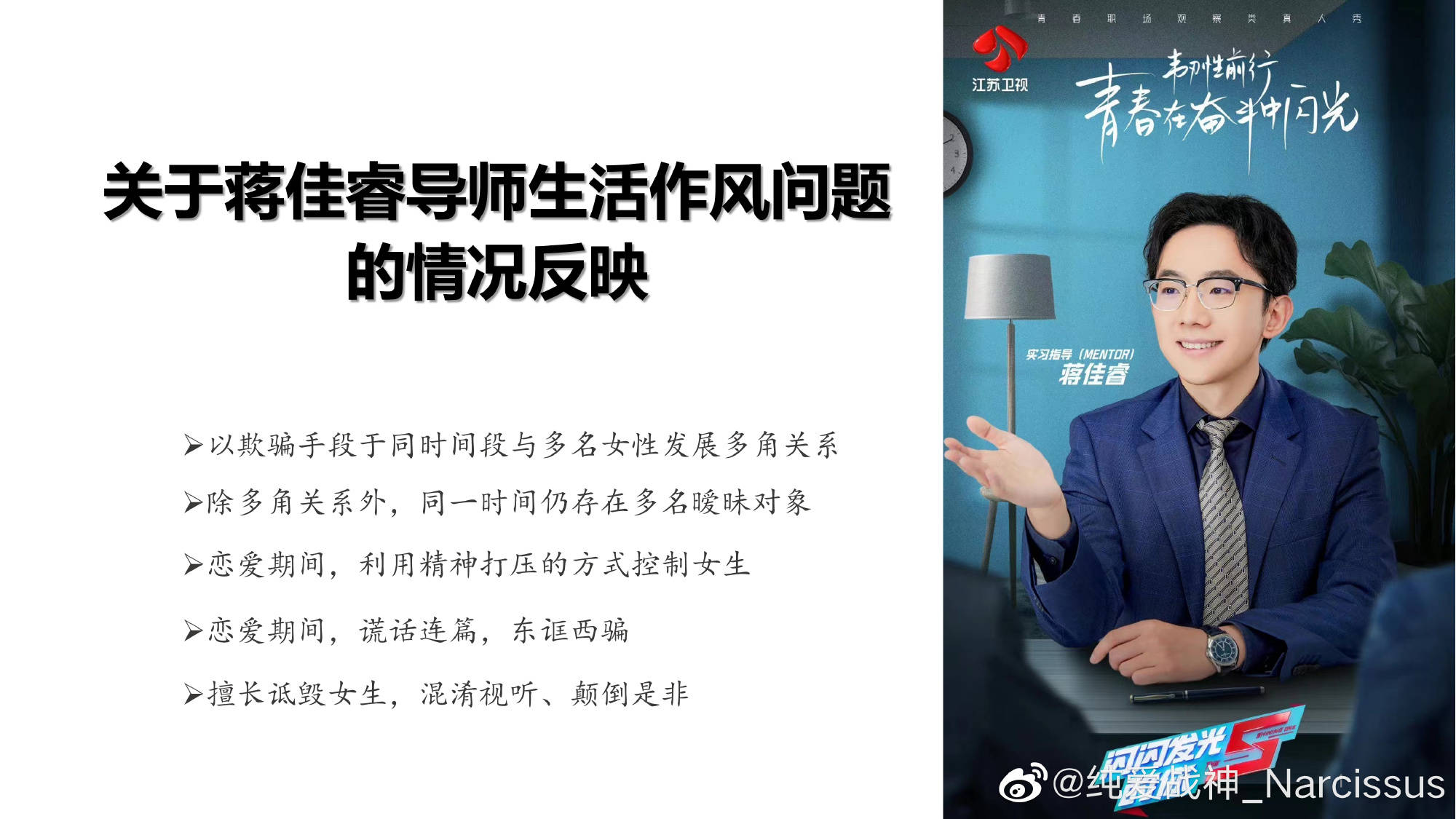 据微博网友发布的“揭露精英投行男内幕”举报文章,《闪闪发光的你》第二季实习指导蒋佳睿,存在严重的生活作风问题,道德败坏。