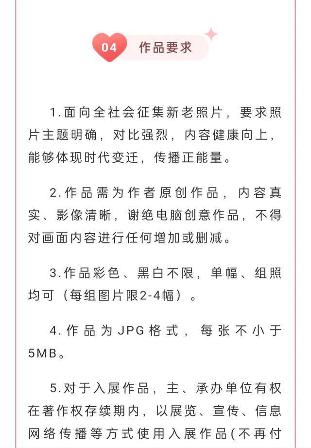 “精彩禹州”微信公众号发布的通知信息显示,此次摄影大赛以“镜头里的禹州”为主题,通过征集新老照片,采用对比的方式,展示同一地点、同一对象在不同时间段的变化,展现历史的沧桑和社会的变革。主办单位为中共禹州市委宣传部 、禹州市总工会,承办单位为禹州市摄影家协会。“作品要求”一项中明确要求:作品需为作者原创作品,内容真实、影像清晰,谢绝电脑创意作品,不得对画面内容进行任何增加或删减。