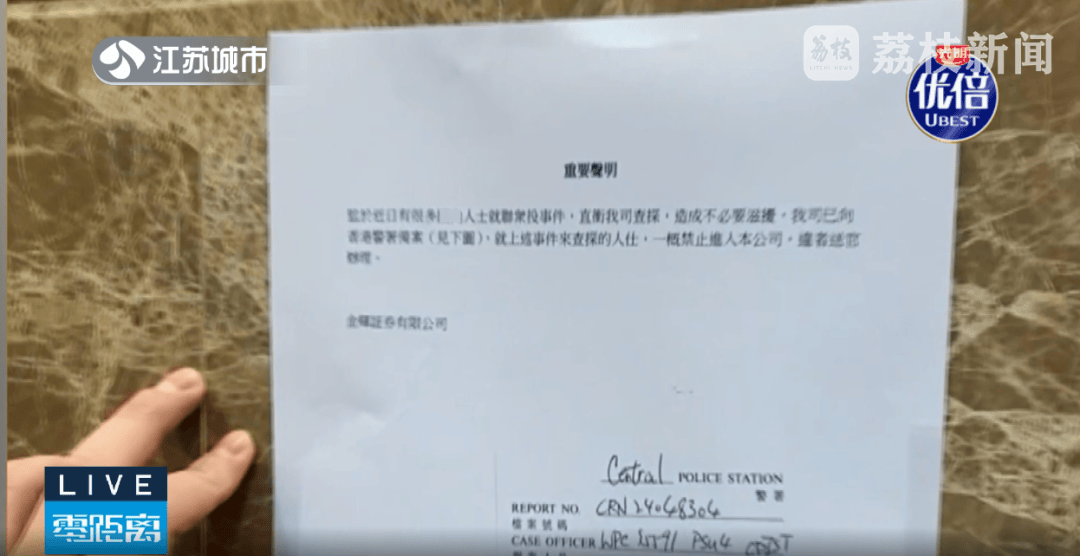 但是有很多人还是蒙在鼓里,今天也有几拨人来这里探求,因为提款手续费的问题。证券公司也向香港警方报了案。整个报案过程我都在现场,与香港的警方也进行了交流,证券公司报案之后出了一个声明。