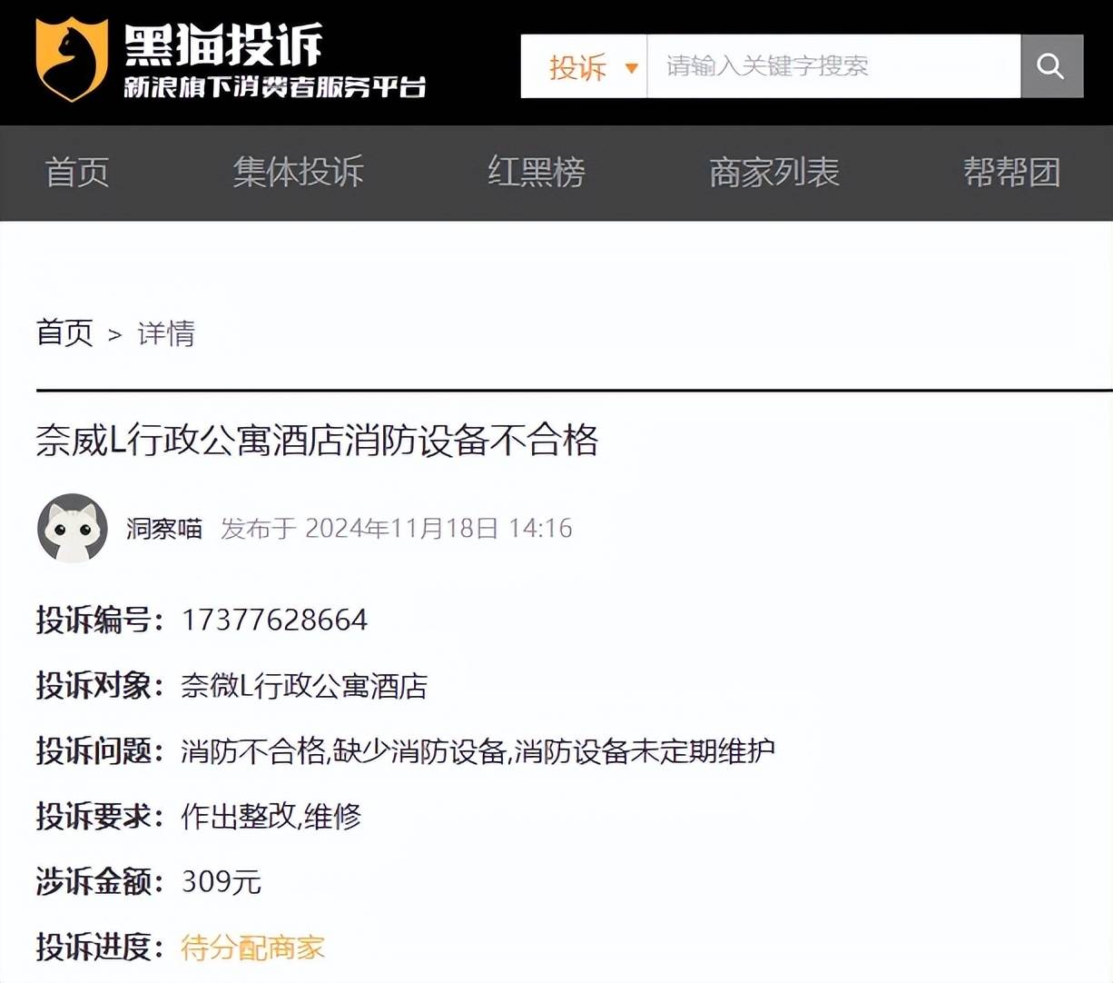 在黑猫投诉平台,还有网友举报奈威行政L公寓酒店酒店消防设施长期未维护,具体体现以下几点:烟雾警报器故障,长期未清洁,灵敏度降低;按钮长期无人检查出现损坏,无法触发报警信号;消防水系统老化,消防栓长期未开启,水带也可能老化出现破损;喷淋系统长期未清理;照明指示标志存在破损、不亮等情况;防火门不打开,呈现关闭状态;防火孔洞未封堵。