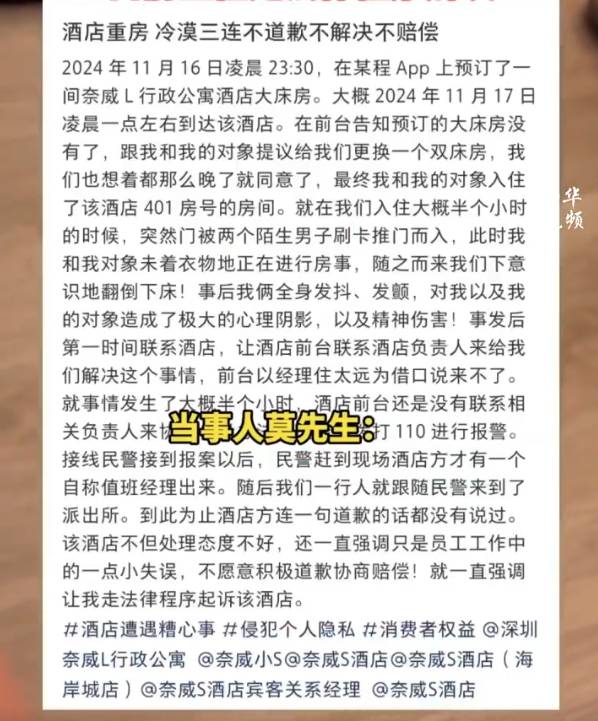 情侣入住奈威酒店亲热时遭两名陌生男子闯入 酒店称搞错房间