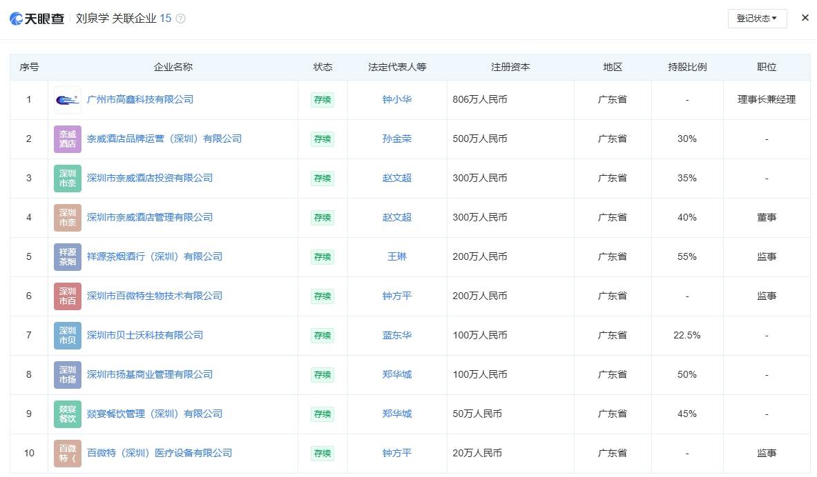 奈威酒店集团运营主体为深圳市奈威酒店管理有限公司。天眼查显示,深圳市奈威酒店管理有限公司成立于2018年5月21日,注册资本300万人民币,法定代表人为赵文超,实际控制人为刘泉学。关联信息显示,刘泉学关联公司有15家,全部处于存续状态,涉及餐饮、酒店、零售、软件、创投、其他服务业等。