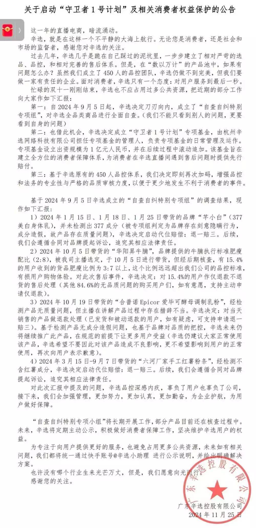 面对这一举报,辛选方面在11月25日晚间公布了自查自纠的调查结果。辛选承认,在10月19日的直播中,主播在讲解“合普诺Epicor爱毕可酵母调制乳粉”时存在措辞不当的问题,并对此表示歉意。同时,辛选还宣布对当天销售的产品进行退款处理,对于已发货和被动退款的用户,如有疑虑,可支持申请退一赔三。
